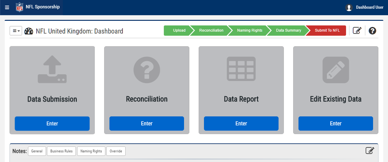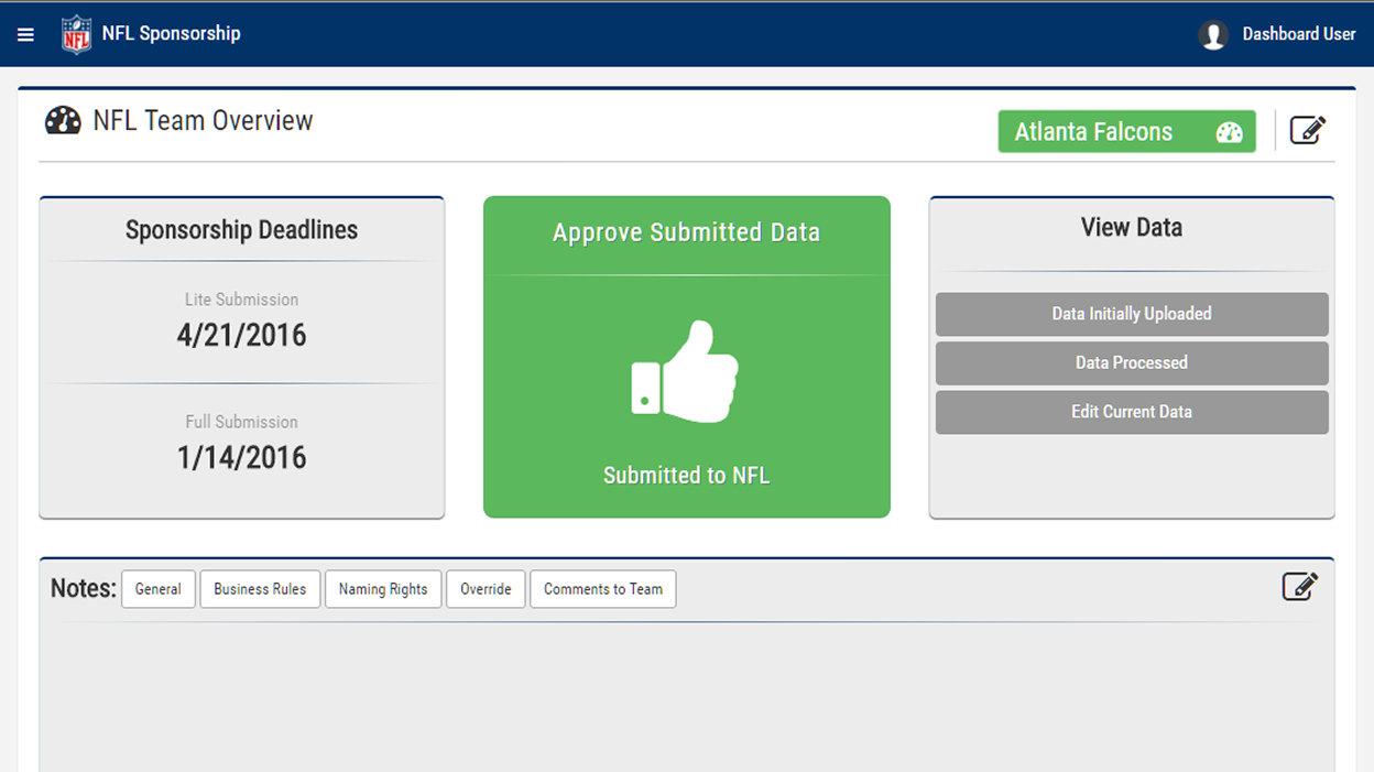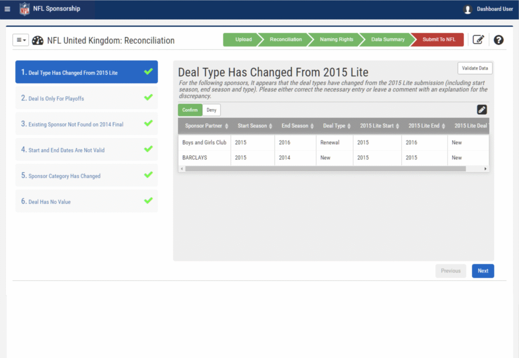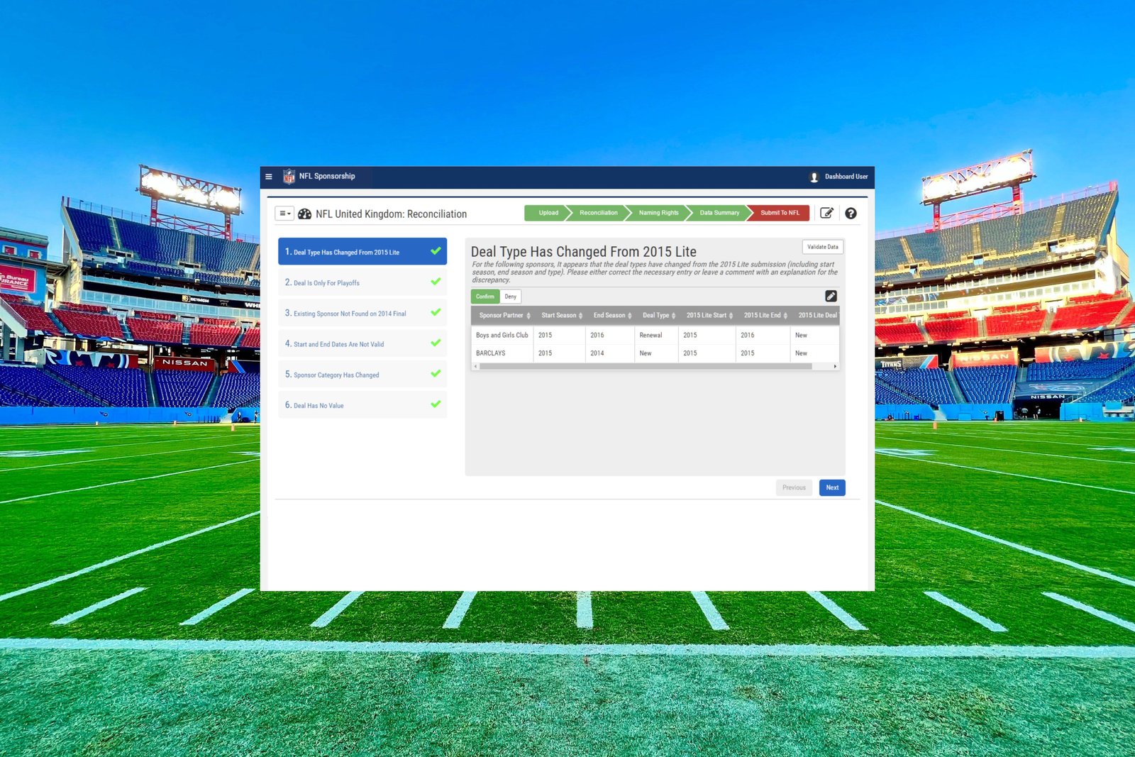 Originally built over 10 years ago, this web-based application was designed for the NFL to replace a fragmented, Excel-driven process used to collect sponsorship data from all 33 teams. Reflective of the design standards and UI patterns of that era, the platform enabled teams to upload, validate, and submit data using automated business rules and admin-controlled feedback loops. The application significantly improved accuracy, efficiency, and consistency across teams and was later white-labeled and adopted by the NHL.